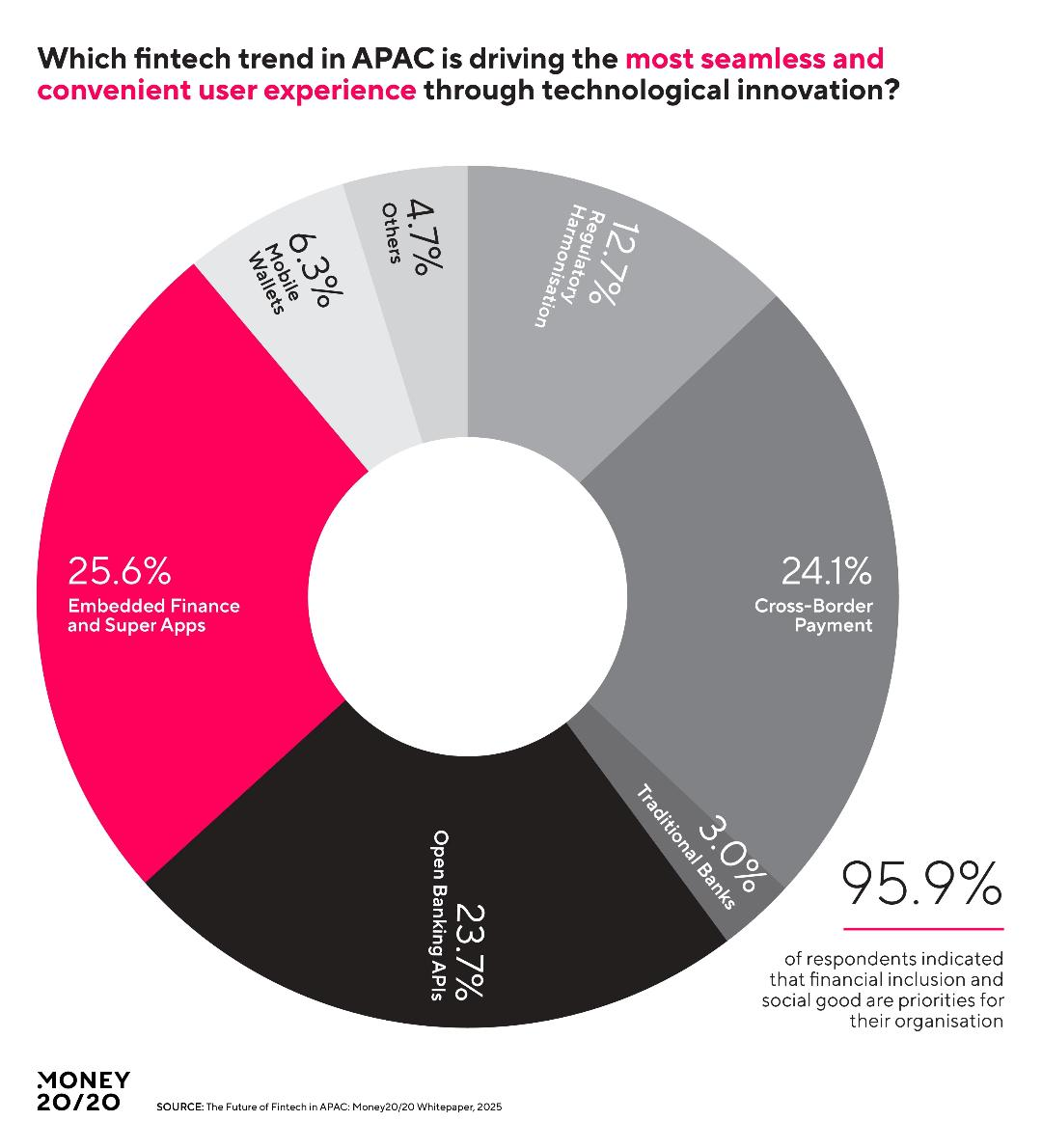 การเปลี่ยนแปลงทางการเงินแบบฝังตัวที่มุ่งเน้นไปที่การบูรณาการและประสบการณ์ผู้ใช้งาน: การเงินแบบฝังตัวกำลังเปลี่ยนแปลงระบบนิเวศฟินเทคของเอเชียผ่านการบูรณาการบริการทางการเงินเข้ากับแพลตฟอร์มด้านอื่น ๆ ที่ไม่เกี่ยวข้องกับการเงิน ผู้นำอย่าง GCash, Boost และ BigPay กำลังปรับปรุงแนวทางในการชำระเงิน การกู้ยืม และการเข้าถึงบริการทางธนาคาร โดยมุ่งเน้นไปที่การปฏิบัติตามกฎระเบียบ ซึ่งบริษัทด้านฟินเทคต่าง ๆ กำลังทำงานอย่างใกล้ชิดกับหน่วยงานกำกับดูแลเพื่อให้มั่นใจถึงความปลอดภัยที่ผู้บริโภคพึงได้รับ โยกย้ายในทิศทางของโมเดล "ซูเปอร์แอป" การเงินแบบฝังตัวกำลังกลายเป็นเรื่องที่เจาะจงในอุตสาหกรรมมากขึ้น โดยบริษัทฟินเทคต่าง ๆ ร่วมมือกับธนาคารเพื่อพัฒนาโซลูชันที่เหมาะสม ตัวอย่างเช่น กระเป๋าเงินดิจิทัลกำลังปรับปรุงธุรกรรมไร้เงินสดในการเรียกใช้บริการรถโดยสาร ยกระดับความสะดวกสบายและความปลอดภัย เมื่อการพัฒนานั้นลุล่วงแล้ว ขั้นตอนต่อไปที่จะเกิดขึ้นจะเปลี่ยนจากการพัฒนานวัตกรรมไปสู่การดำเนินงานในแง่ของกิจการร่วมกัน โดยเน้นที่การช่วยให้ธุรกิจต่างๆ บูรณาการบริการทางการเงินเข้ากับการดำเนินงานของตนได้มากขึ้น