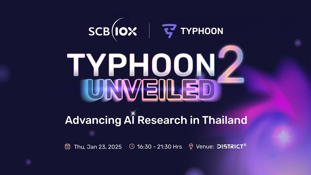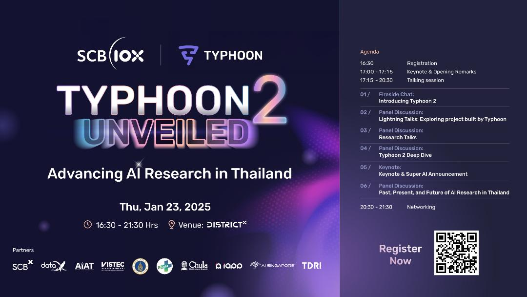 สำหรับผู้ที่สนใจเข้าร่วมงาน “Typhoon 2 Unveiled: Advancing AI Research in Thailand” สามารถลงทะเบียนได้ที่ https://lu.ma/droty4z9 หรือติดตามข้อมูลเกี่ยวกับ “ไต้ฝุ่น 2” และร่วมทดลองใช้งานโมเดลภาษาไทยขนาดใหญ่ เวอร์ชั่นใหม่ล่าสุด ได้ที่ https://opentyphoon.ai/