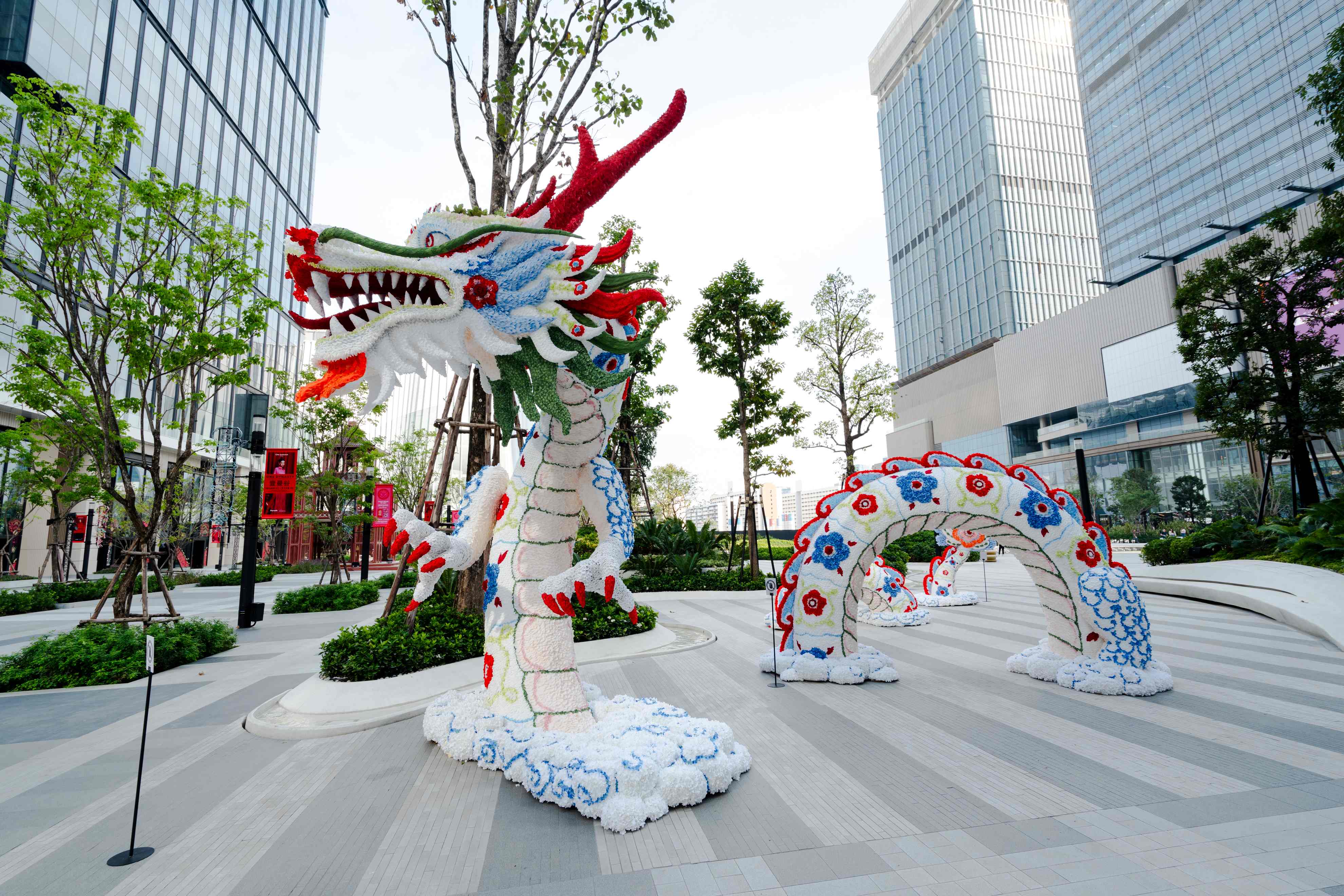 • The Twin Dragons ที่ เดอะ สตอรี่ส์ สแควร์ พบกับมังกรฝาแฝดแห่งผืนฟ้าที่เต้นรำอย่างสง่างาม ไปกับแสงของดวงอาทิตย์ยามเช้าและดวงดาวในยามคํ่าคืน ร่างของมังกรทั้งสองเกี่ยวพันกันเป็นเลข “8” ซึ่งเป็นสัญลักษณ์ของความอมตะ ความมั่งคั่งที่ไม่สิ้นสุด เฉกเช่นเดียวกับการเดินลอดท้องมังกรในขบวนแห่มังกรซึ่งถูกเชื่อว่าจะนำโชคลาภมาให้ การติดตั้งงานศิลปะนี้เชิญชวนทุกคนให้ก้าวเข้าสู่พื้นที่แห่งความโชคดีอันไร้ขีดจำกัด ต่อเนื่องมาถึงโซน พาเหรด สแควร์ นำเสนอมังกรคู่รักที่เฉลิมฉลองความรัก เต้นรำอย่างร่าเริงในสวนดอกคามิเลียสีแดงสด ซึ่งสื่อถึงภูมิปัญญาแห่งความรัก พร้อมมอบพรให้กับผู้มาเยือนผ่านพัดวิเศษ พัดเหล่านี้มีความหมายในการพัดพาสิ่งที่ไม่ต้องการออกไป และนำพาคำอธิษฐานที่เรารักใคร่ให้เข้ามาใกล้ตัว โดยความงดงามของลายเส้น The Twin Dragons ถูกรังสรรรค์ขึ้นโดยศิลปินชื่อดัง ‘ยูน-ปัณพัท เตชเมธากุล’