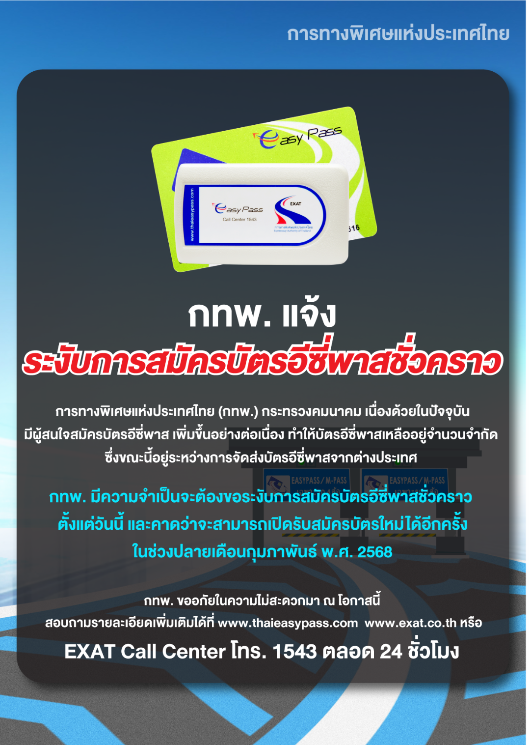 การทางพิเศษแห่งประเทศไทย (กทพ.) กระทรวงคมนาคม เนื่องด้วยในปัจจุบันมีผู้สนใจสมัครบัตรอีซี่พาส เพิ่มขึ้นอย่างต่อเนื่อง ทำให้บัตรอีซี่พาสเหลืออยู่จำนวนจำกัด ซึ่งขณะนี้อยู่ระหว่างการจัดส่งบัตรอีซี่พาส จากต่างประเทศ กทพ. มีความจำเป็นขอระงับการสมัครบัตรอีซี่พาสชั่วคราวตั้งแต่วันนี้ และคาดว่าจะสามารถเปิดรับสมัครบัตรใหม่ได้อีกครั้งในช่วงปลายเดือนกุมภาพันธ์ พ.ศ. 2568