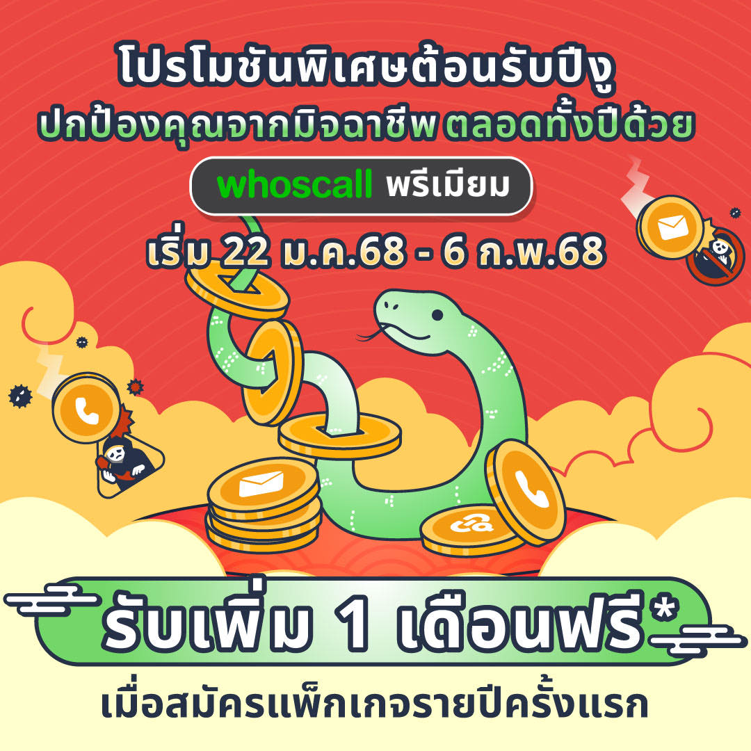 กรุงเทพฯ 23 มกราคม 2568 บริษัท โกโกลุก ประเทศไทย ผู้ให้บริการแอปพลิเคชัน Whoscall ร่วมส่งความสุข ขจัดภัยมิจฉาชีพ ต้อนรับเทศกาลตรุษจีน มอบสิทธิพิเศษเฉพาะลูกค้าใหม่! เพียงสมัคร Whoscall Premium แบบรายปี 599 บาท/ต่อปี รับสิทธิ์ทดลองใช้บริการฟรี 30 วัน ตั้งแต่วันนี้ถึง 6 กุมภาพันธ์ 2568