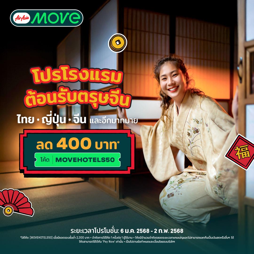 AirAsia MOVE ซูเปอร์แอปด้านการเดินทางและการท่องเที่ยวครบวงจรชั้นนำในภูมิภาคอาเซียนตั้งแต่การเดินทางทางอากาศจนถึงภาคพื้นดิน พร้อมช่วยคุณจองตั๋วเครื่องบินและที่พักชั้นนำในจุดหมายปลายทางยอดนิยมจากทั่วทุกมุมโลก ไม่รอช้าส่งดีลต้อนรับปีใหม่จีนและกระแสการท่องเที่ยวอันร้อนแรง! ด้วยดีลส่วนลดโรงแรมสุดคุ้ม! ด้วยส่วนลด 400 บาท! เพียงใส่โค้ด: [MOVEHOTELS50] เมื่อมียอดใช้จ่ายขั้นต่ำ 2,300 บาท สำหรับที่พักในไทย ญี่ปุ่น จีน และโรงแรมอื่นๆทั่วโลก จำกัดการใช้โค้ด 1 ครั้งต่อ 1 ผู้ใช้งาน • โค้ดมีจำนวนจำกัดตลอดระยะเวลาแคมเปญและไม่สามารถแลกคืนเป็นเงินสดหรืออื่นๆ ได้ โค้ดสามารถใช้ได้กับ 'Pay Now' เท่านั้น เป็นไปตามข้อกำหนดและเงื่อนไขของบริษัทฯ