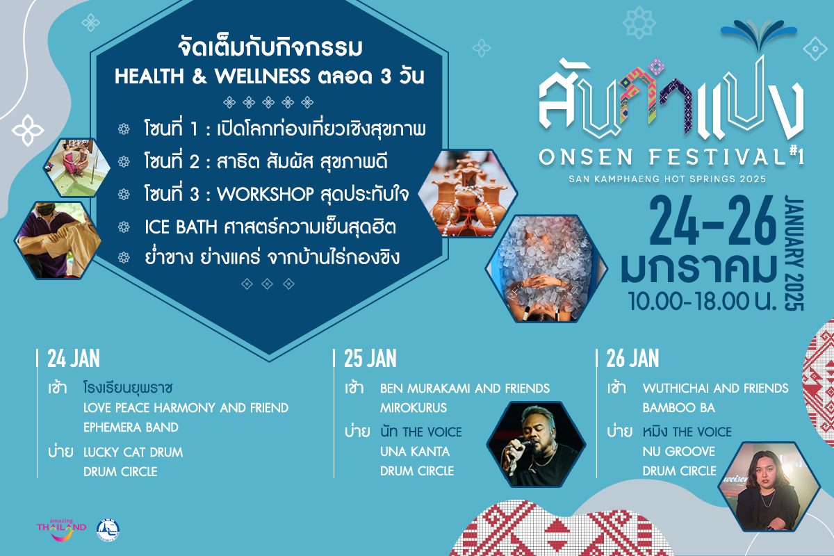 “สันกำแปง ONSEN FESTIVAL #1” ครั้งนี้ นับเป็นการส่งเสริมการท่องเที่ยวเชิงสุขภาพที่เชื่อมโยงธรรมชาติ วัฒนธรรม และวิถีชุมชนอย่างแท้จริง โดยผู้ที่สนใจสามารถเข้าร่วมงานได้ตั้งแต่วันที่ 24-26 มกราคม 2568 ณ น้ำพุร้อนสันกำแพง อำเภอแม่ออน ตามพระราชดำริ จังหวัดเชียงใหม่ และสามารถสอบถามรายละเอียดเพิ่มเติมได้ที่โทร 1672 Travel Buddy