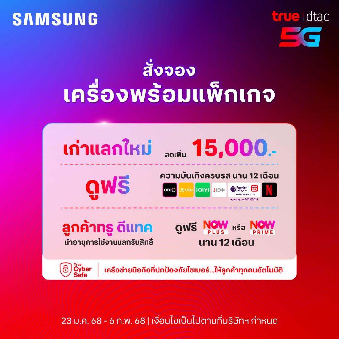 กรุงเทพฯ 23 มกราคม 2568 – ฉลาดล้ำ กับเครือข่าย 5G ที่เร็วแรงที่สุด...ทรู ดีแทค 5G พลังสัญญาณครอบคลุมทุกพื้นที่ ทั่วไทย เปิดจองล่วงหน้าให้เป็นเจ้าของ Samsung Galaxy S25 ฉลาดล้ำ ก่อนใคร!!! สิทธิพิเศษและข้อเสนอที่ดีที่สุดสำหรับลูกค้าทรู ดีแทคเท่านั้น เมื่อนำเครื่องเก่ามาแลกใหม่ พร้อมสมัครแพ็กเกจรายเดือนเริ่มต้น 699 บาท การันตีรับส่วนลดเพิ่มสูงสุด 15,000 บาท ดูฟรี ความบันเทิงครบรส ดูฟรี EPL ตลอดฤดูกาลลูกค้าทรู ดีแทค นำอายุการใช้งานรับสิทธิพิเศษเพิ่มเติมมากมายและยังผ่อน 0% นาน 36 เดือน หรือผ่อนสบายไม่ง้อบัตร นาน 48 เดือน กับ PAY NEXT EXTRA พร้อมรับเงินคืน รวมสูงสุด 7,000 บาทจองเลย ตั้งแต่วันนี้ถึง 6 กุมภาพันธ์นี้ ที่ทรูช็อป ดีแทคช็อป ทรูสเฟียร์ ทุกสาขา Line @Truestore / FB Truestore และช่องทางออนไลน์ https://deal.true.th/samsung/galaxy-s25-series.html พร้อมเปิดตัว “เต-ตะวัน วิหครัตน์” Co Presenter และภาพยนตร์โฆษณา ชุด “ผู้ช่วยส่วนตัวคนใหม่”