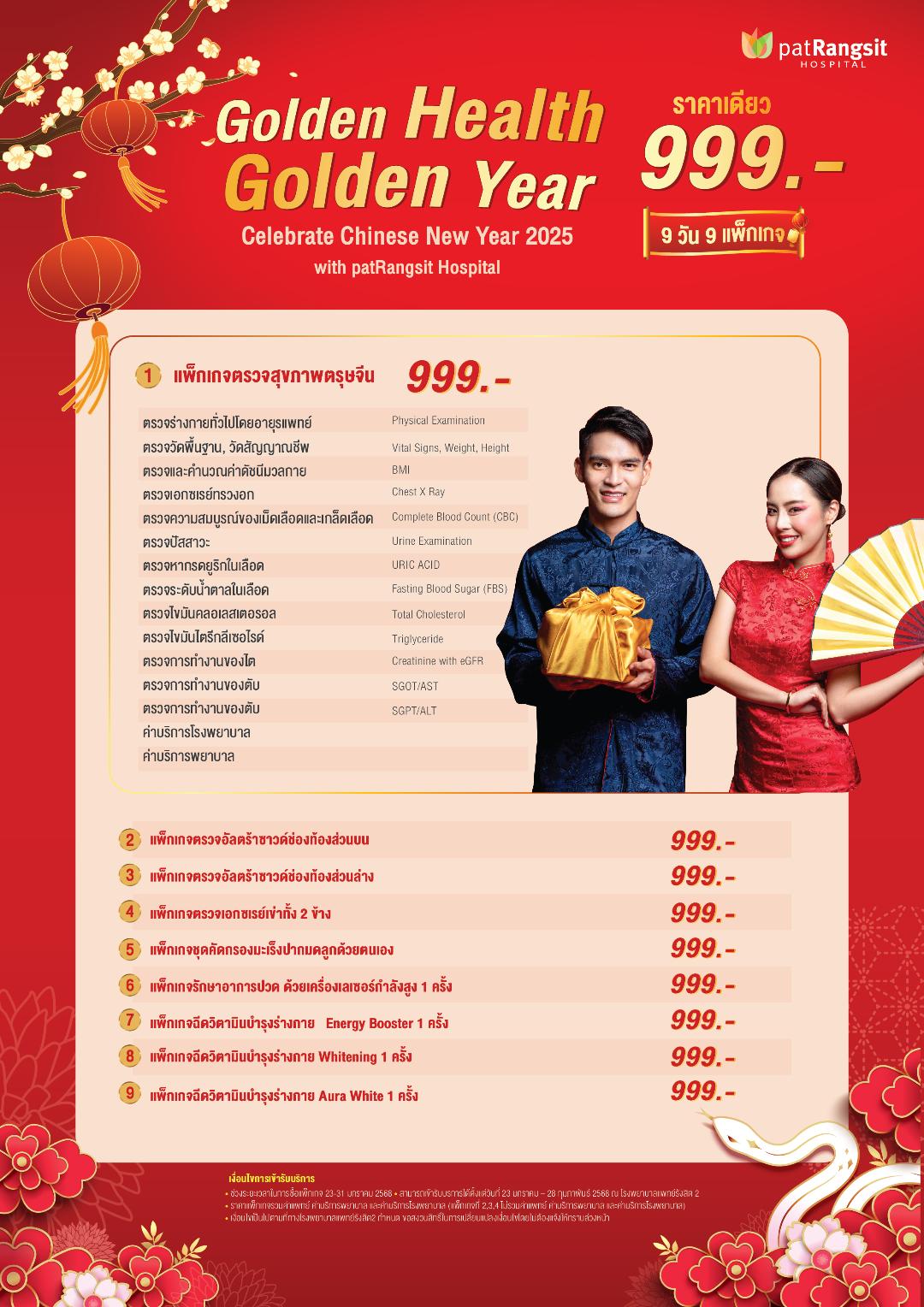 ขอเชิญชวนทุกท่านร่วมเฉลิมฉลองเทศกาลตรุษจีนปี 2025 ด้วยแคมเปญพิเศษ "Golden Health, Golden Year" 9 วัน 9 แพ็กเกจ ราคาเดียว 999.- บาท กลุ่มโรงพยาบาลแพทย์รังสิต มุ่งมั่นที่จะเป็นส่วนหนึ่งในทุกการเริ่มต้นที่ดีของชีวิตคุณในปีใหม่จีนนี้ ด้วยการให้บริการทางการแพทย์ที่มีคุณภาพ และหวังว่าทุกท่านจะได้สัมผัสกับ "Golden Health" ที่จะนำพาคุณไปสู่ "Golden Year" ที่เต็มไปด้วยสุขภาพดีและความโชคดีตลอดปี