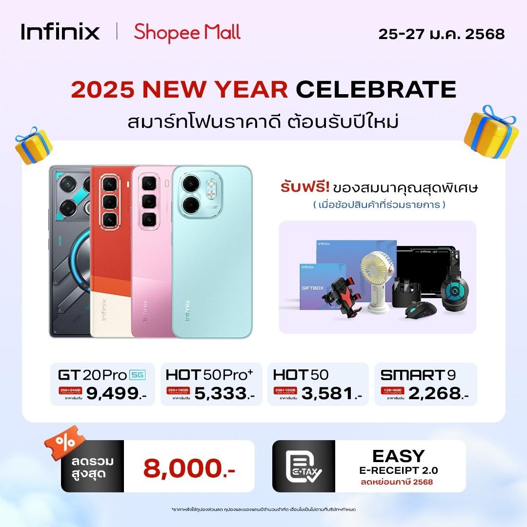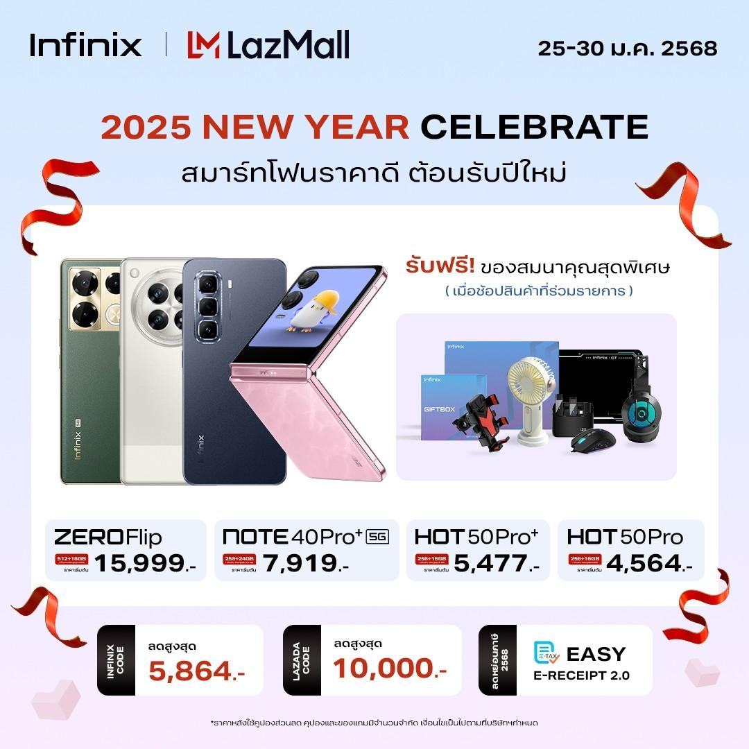 กรุงเทพฯ 24 มกราคม 2568 – อินฟินิกซ์ (Infinix) แบรนด์สมาร์ทโฟนระดับโลกที่มอบความคุ้มค่า ครบครันทุกการใช้งาน และตอบโจทย์ไลฟ์สไตล์คนรุ่นใหม่ ประเดิมต้นปีแบบร้อนแรงให้เหล่านักช้อปได้พบความคุ้มค่าขั้นสุดของสมาร์ทโฟนและสินค้าแกดเจ็ตรุ่นยอดฮิต รับปีใหม่จีนด้วยโปรโมชัน “New Year Celebrate” แจกโค้ดส่วนลดผ่าน 3 แพลตฟอร์มช้อปปิ้งออนไลน์ ได้แก่ Shopee, Lazada และ TikTok Shop รวมมูลค่าสูงสุด 10,000 บาท เริ่มต้นที่ สมาร์ทโฟนรุ่นใหม่แกะกล่อง HOT 50 Pro+ Series ดีไซน์บางเฉียบ ในราคาเริ่มต้นเพียง 5,399 บาท ต่อด้วย GT Series ที่ขนมาทั้งเกมมิ่งโฟนสุดคูล GT20 Pro ที่รองรับอัตราเฟรมเรตได้ถึง 120 FPS เริ่มต้นเพียง 9,499 บาท และแล็ปท็อป GT BOOK GL613 ปล่อยพลังแรง พร้อมลุยทุกเกมเริ่มต้นเพียง 25,900 บาท หรือจะเป็นแล็ปท็อปที่ครบทุกการใช้งานอย่างรุ่น Y3 MAX เริ่มต้น 12,997 บาท พิเศษ! เมื่อช้อปแล็ปท็อปทั้งสองรุ่นรับฟรีของแถม GT Book Boxset มูลค่า 1,999 บาท นอกจากนี้ยังมี Note 40 Pro+ 5G สมาร์ทโฟนชาร์จเร็ว ชาร์จแรง ลูกเล่นครบ ที่เริ่มต้นเพียง 7,999 บาท พร้อมรับของแถม New Year Gift Box มูลค่า 990 บาท หรือเลือกเป็น ZERO 40 5G สมาร์ทโฟนเรียบหรูดูพรีเมี่ยมที่มาในราคาเริ่มต้น 10,333 บาท รวมถึงสมาร์ทโฟนจอพับจัดเต็มอย่าง ZERO Flip ที่เริ่มต้น 15,999 บาท ปิดท้ายด้วยรุ่น Smart 9 สมาร์ทโฟนของมันต้องมีที่มาพร้อมทั้งกล้องสวย แบตอึด ลำโพงคู่ในราคาเริ่มต้นเพียง 2,369 บาท เท่านั้น