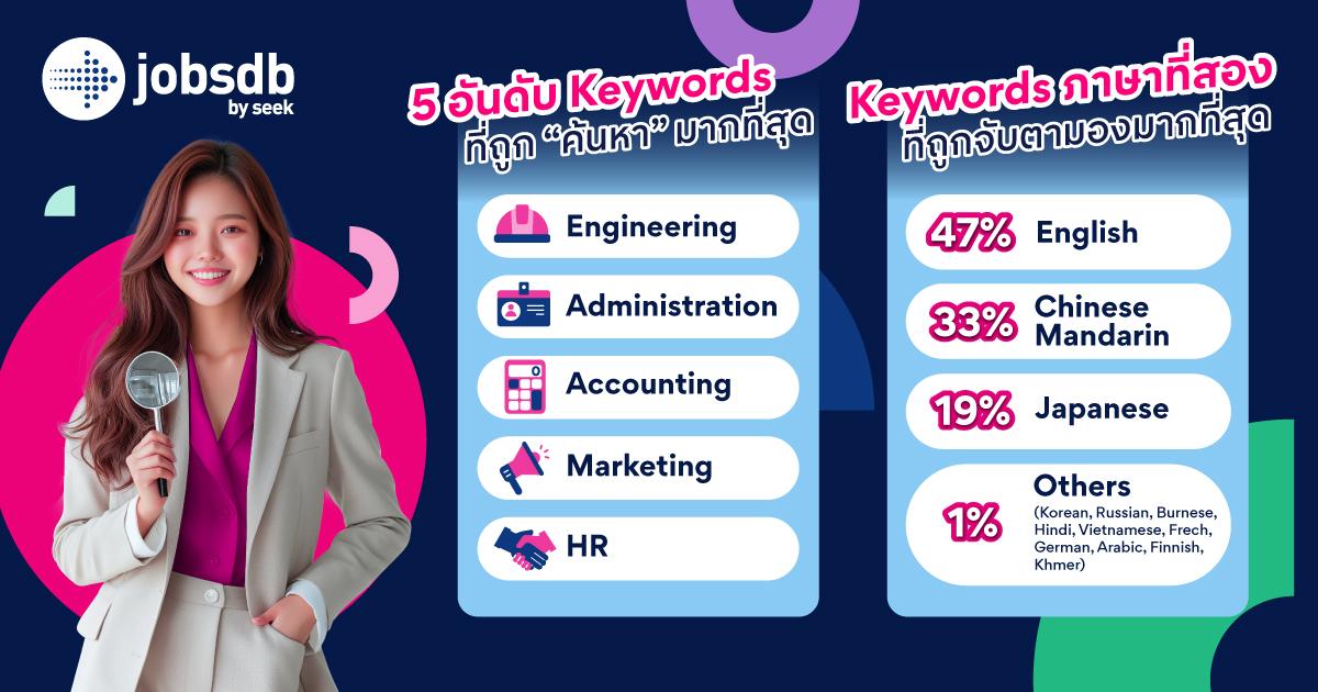 จากข้อมูลการค้นหาของผู้สมัครงานผ่าน Jobsdb by SEEK พบว่า 5 คำค้นหางานที่ได้รับความสนใจมากที่สุดในกลุ่มคนหางานปี 2567 ได้แก่: