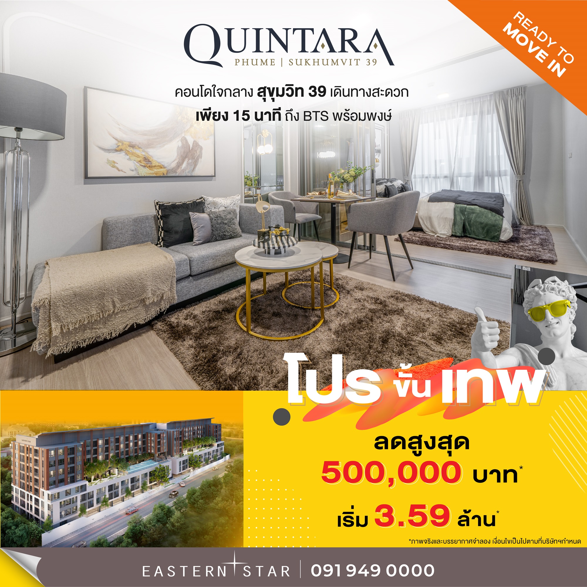 โครงการควินทารา ภูม สุขุมวิท 39 คอนโดสไตล์รีสอร์ท Feeling โรงแรม ห้องใหญ่และคุ้มค่ากับราคาเริ่มต้น 3.59 ล้านบาท* พร้อมอยู่เช่นกัน สะดวกสบายเชื่อมต่อการเดินทางที่หลากหลาย ทั้งใกล้ BTS สถานีพร้อมพงษ์ MRT สถานีเพชรบุรีตัดใหม่ รวมทั้งท่าเรืออิตัลไทย ซึ่งหากจองเดือนนี้รับส่วนลดสูงสุด 500,000 บาท* เช่นกัน ฟรีเงินทำสัญญา 0 บาท ฟรีเฟอร์นิเจอร์ พร้อมเครื่องใช้ไฟฟ้า คอนโดราคา 3 ล้านกลางๆ บอกเลยโซนนี้หายากมากๆ
