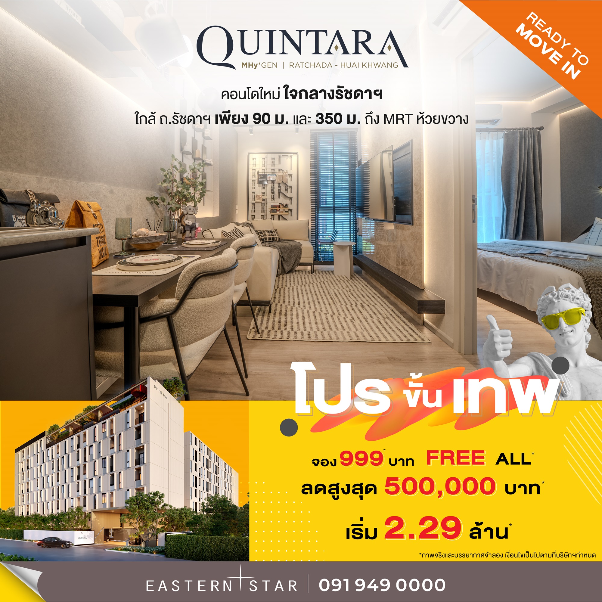สำหรับในทำเลฝั่งธนบุรีใกล้สาทร ESTAR นำโครงการเรือธง ควินทารา มาย’เดน โพธิ์นิมิตร คอนโดสูง High Rise High Life วิวโค้งแม่น้ำเจ้าพระยาและ ICON SIAM จัดราคาพิเศษเริ่มต้นเพียง 2.89 ล้านบาท จำกัดยูนิตมาก่อนได้ก่อน เรียกได้ว่าเป็นคอนโดฯ เกือบจะตึกเดียวในโซนนี้ที่ติด BTS สถานีโพธิ์นิมิตร 0 เมตร* สะดวกขั้นเทพเดินทางเข้าสาทรเพียง 15 นาที* เท่านั้น เดือนพิเศษรับส่วนลดสูงสุด 500,000 บาท* ฟรีบัตรรถไฟฟ้ามูลค่า 5,000 บาท* พร้อมเข้าอยู่ภายในปี 2568 นี้ ราคาและโปรแรงขั้นเทพจัดเฉพาะเดือนนี้เท่านั้น” นายไพโรจน์ กล่าว