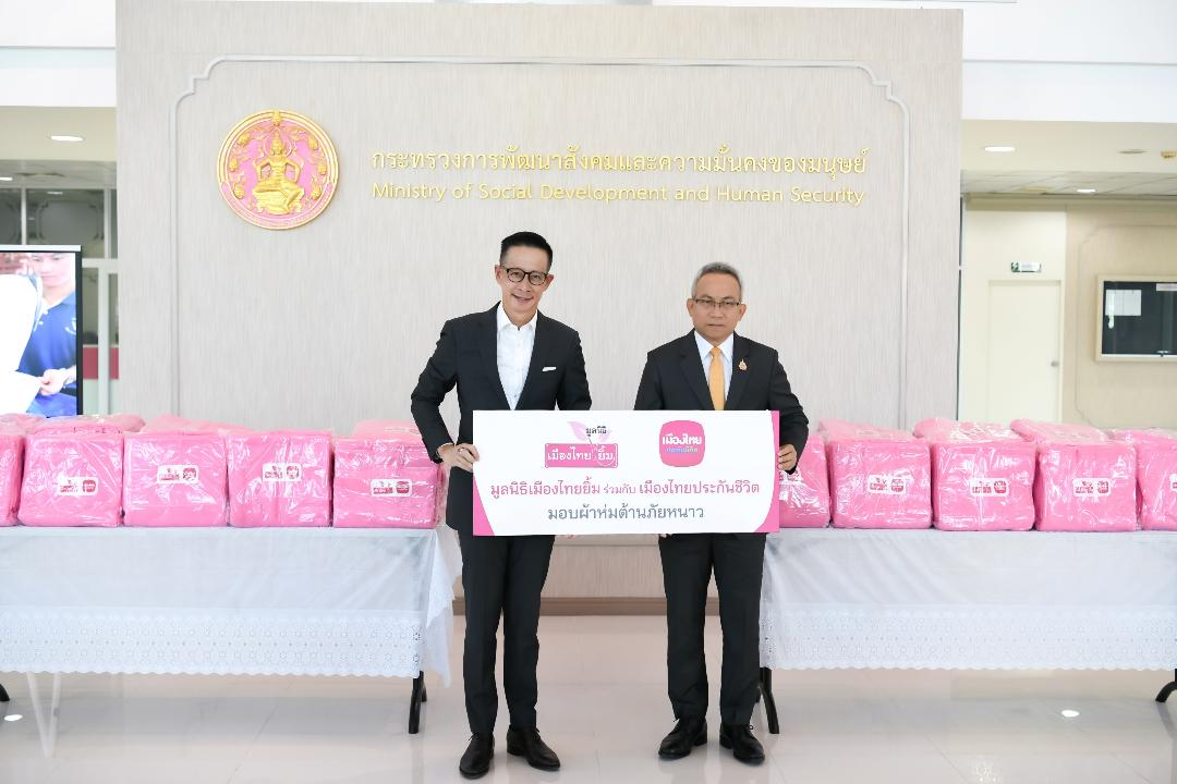 ตามที่ บริษัท เมืองไทยประกันชีวิต จำกัด (มหาชน) และ มูลนิธิเมืองไทยยิ้ม ได้ติดตามสถานการณ์ภัยหนาวในประเทศไทย ตั้งแต่ปลายปี 2567 พบว่าพี่น้องคนไทยในหลายพื้นที่ได้รับผลกระทบจากการเปลี่ยนแปลงสภาพภูมิอากาศ ดังนั้นเพื่อส่งเสริมและสนับสนุนการบริหารจัดการของทางภาครัฐ ตามแนวนโยบายของ กระทรวง พม. เพื่อให้ความช่วยเหลือแก่ประชาชน นายสาระ ล่ำซำ ประธานเจ้าหน้าที่บริหาร บริษัท เมืองไทยประกันชีวิต จำกัด (มหาชน) และ นางพิตราภรณ์ บุณยรัตพันธุ์ รองประธานกรรมการ มูลนิธิเมืองไทยยิ้ม ส่งมอบผ้าห่มกันหนาว จำนวน 300 ผืน มอบให้แก่ นายอนุกูล ปีดแก้ว ปลัดกระทรวงการพัฒนาสังคมและความมั่นคงของมนุษย์ พร้อมด้วยนางจตุพร โรจนพานิช รองปลัดกระทรวงการพัฒนาสังคมและความมั่นคงของมนุษย์ นางสาวแรมรุ้ง วรวัธ อธิบดีกรมกิจการสตรีและสถาบันครอบครัว นายกันตพงศ์ รังษีสว่าง อธิบดีกรมพัฒนาสังคมและสวัสดิการ นางสาวสนธยา บุณยภูษิต หัวหน้าผู้ตรวจราชการกระทรวงการพัฒนาสังคมและความมั่นคงของมนุษย์ และคณะผู้บริหารกระทรวงการพัฒนาสังคมและความมั่นคงของมนุษย์ร่วมรับมอบเพื่อบรรเทาทุกข์และรับมือภัยหนาวให้แก่กลุ่มเปราะบางที่มีเด็กเล็ก ผู้สูงอายุ และคนพิการในหลายพื้นที่ กิจกรรมดังกล่าว จัดขึ้น ณ กระทรวงการพัฒนาสังคมและความมั่นคงของมนุษย์