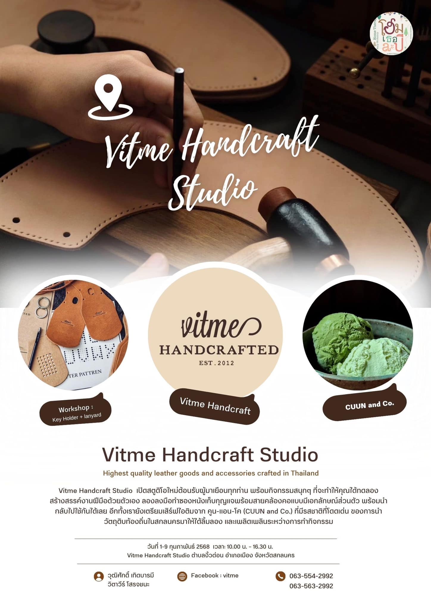 - ทำที่เก็บกุญเเจจากหนังเเท้ย้อมครามพร้อมสายคล้องคอ (Key Holder + lanyard) พร้อมเสิร์ฟไอติมจาก คูน-แอน-โค (CUUN and Co.) ที่มีรสชาติโดดเด่นด้วยการนำวัตถุดิบท้องถิ่นในสกลนครมาให้ผู้เข้าร่วมกิจกรรมได้ลิ้มลอง