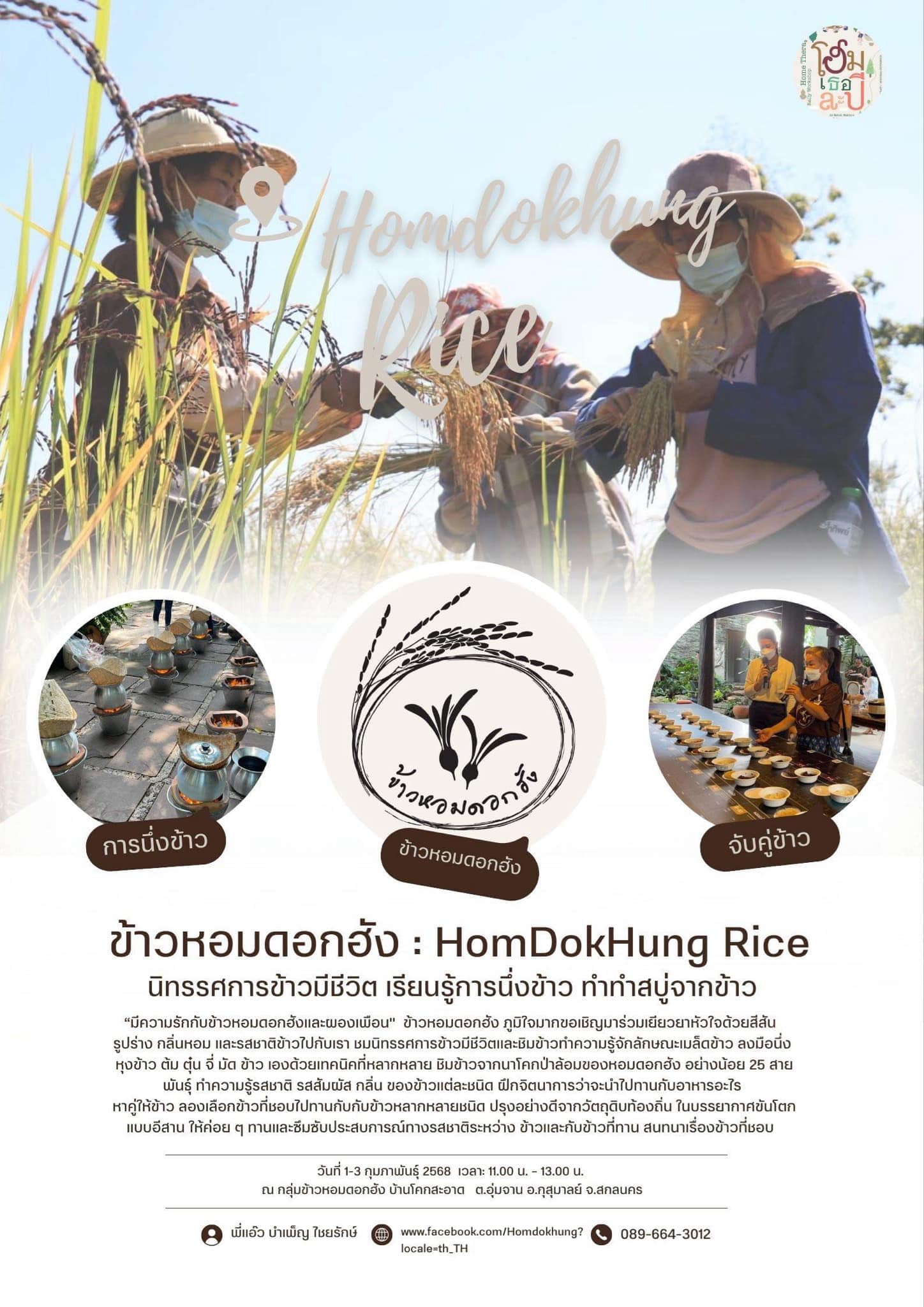 ช่องทางการติดต่อ : Facebook Page : ข้าวหอมดอกฮัง : Homdokhung Rice หรือ โทร. 089 664 3012 (คุณบำเพ็ญ ไชยรักษ์)