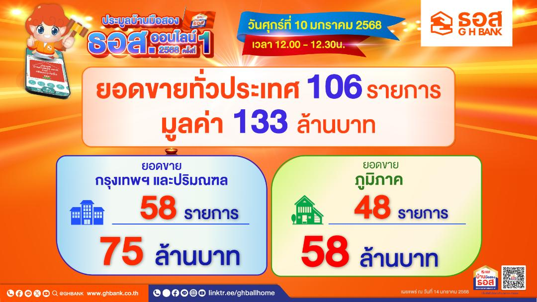 " มีบ้านรับปีใหม่! ธอส. เผยผลการประมูลบ้านมือสองออนไลน์ ประจำเดือนมกราคม 2568 สามารถจำหน่ายได้ 106 รายการ มูลค่ารวมกว่า 133 ล้านบาท"