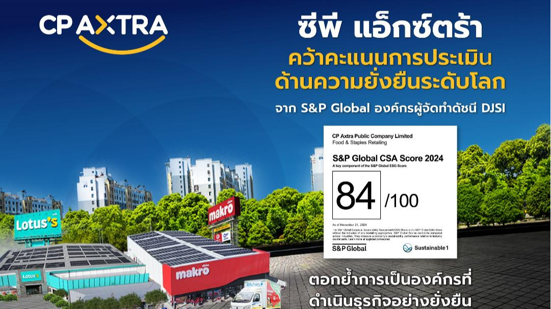 ซีพี แอ็กซ์ตร้า คว้าคะแนนการประเมินด้านความยั่งยืน 84/100 คะแนน สูงเป็นอันดับ 4 ของโลก ในกลุ่มอุตสาหกรรม Food & Staples Retailing จาก S&P Global องค์กรผู้จัดทำดัชนี DJSI ตอกย้ำการเป็นองค์กรแห่งความยั่งยืนในระดับสากล