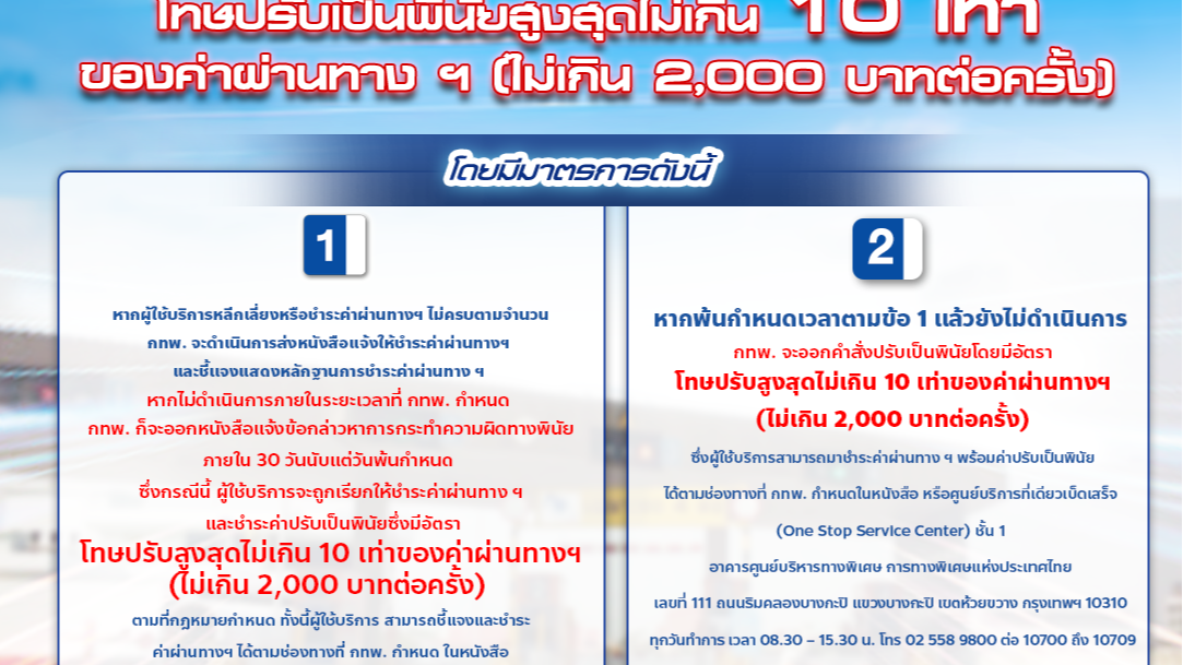 1 ม.ค. 68 กทพ. เริ่มปรับผู้หลีกเลี่ยงหรือชำระค่าผ่านทางพิเศษไม่ครบตามจำนวน ระวังต้องโทษปรับเป็นพินัยสูงสุดไม่เกิน 10 เท่าของค่าผ่านทาง ฯ