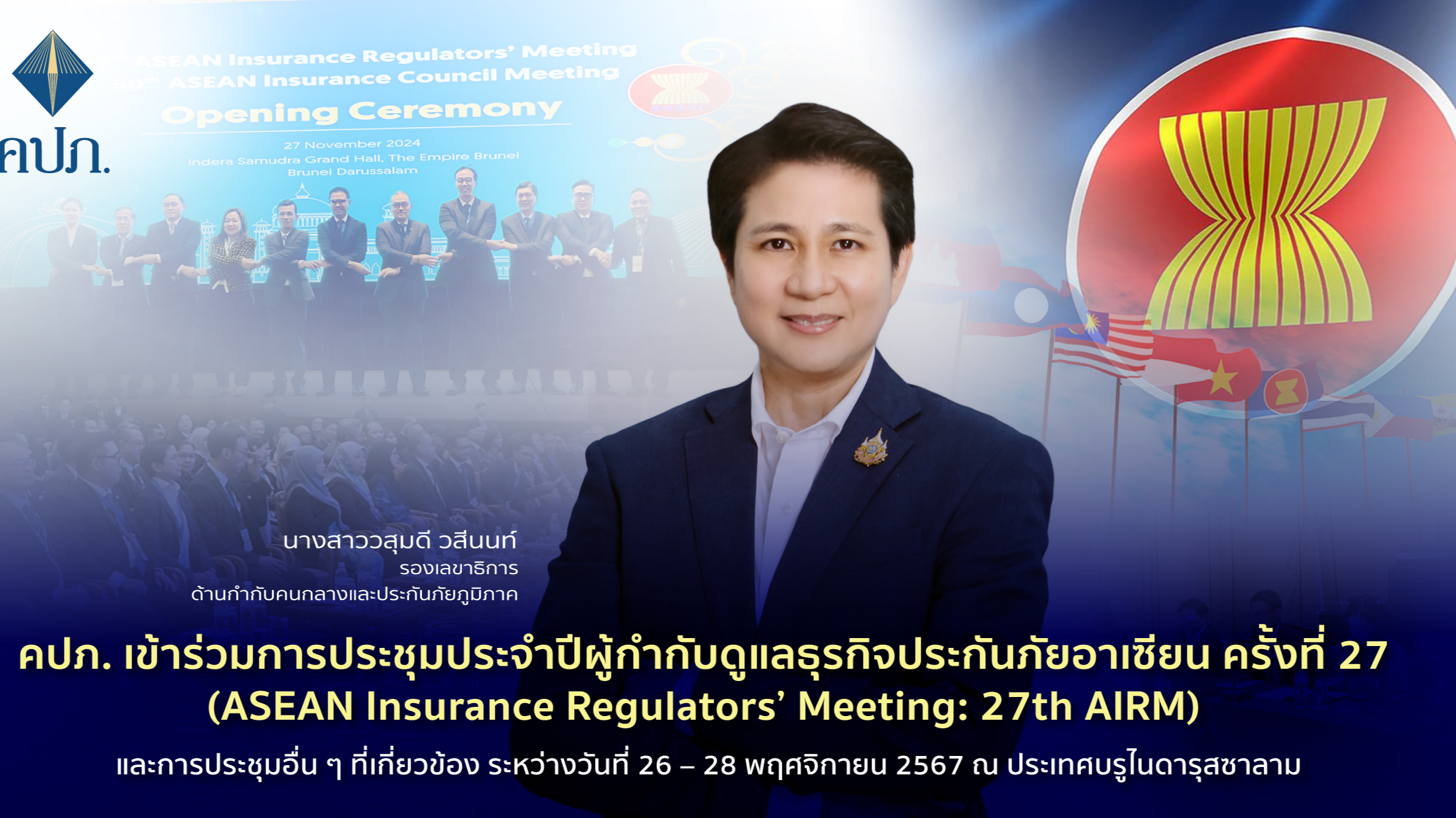 คปภ. เข้าร่วมการประชุมประจำปีผู้กำกับดูแลธุรกิจประกันภัยอาเซียน ครั้งที่ 27 (ASEAN Insurance Regulators’ Meeting: 27th AIRM) และการประชุมอื่น ๆ ที่เกี่ยวข้อง ระหว่างวันที่ 26 – 28 พฤศจิกายน 2567 ณ ประเทศบรูไนดารุสซาลาม