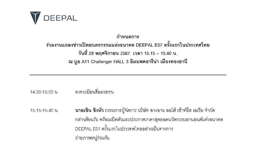 กำหนดการ ร่วมงานแถลงข่าวเปิดยนตรกรรมแห่งอนาคต DEEPAL E07 ครั้งแรกในประเทศไทย วันที่ 28 พฤศจิกายน 2567 เวลา 15.15 – 15.40 น. ณ บูธ A11 Challenger HALL 3 อิมแพคอารีน่า เมืองทองธานี