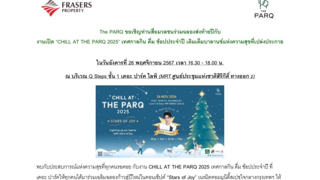 The PARQ ขอเชิญท่านสื่อมวลชนร่วมฉลองส่งท้ายปี กับงานเปิด “CHILL AT THE PARQ 2025” เทศกาล กิน ดื่ม ช้อป ประจำปี ที่ เดอะ ปาร์ค