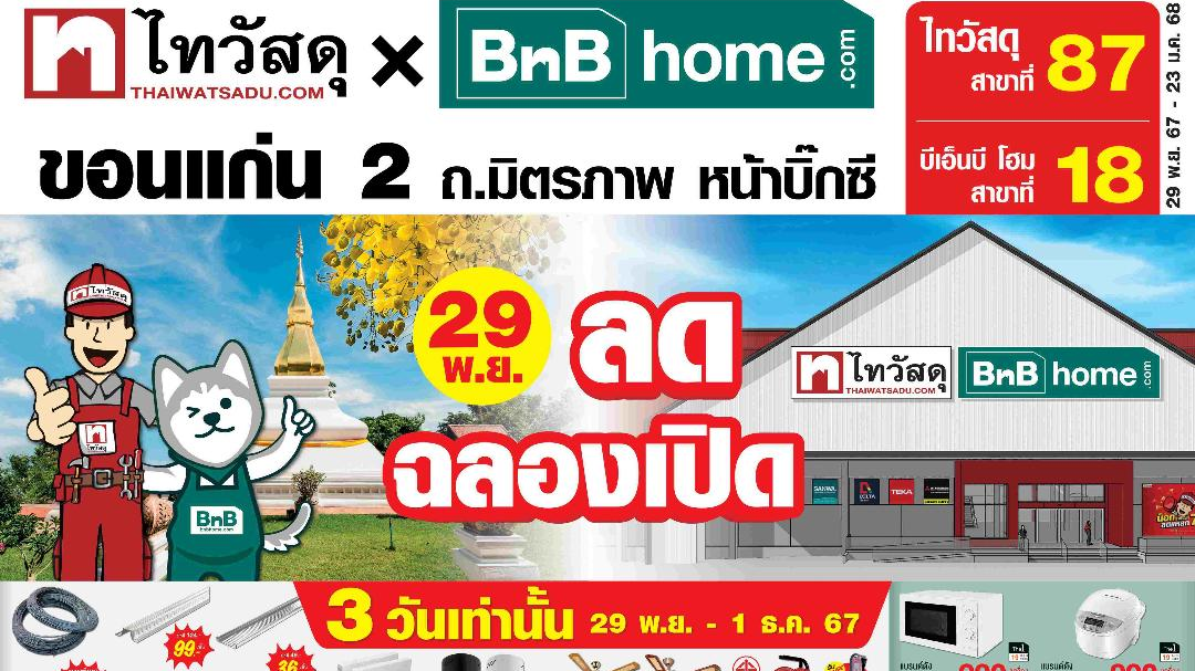 ฉลองต้อนรับ “ไทวัสดุ x บีเอ็นบี โฮม สาขาขอนแก่น” มอบโปรฯ ลดหนัก 3 วันเต็ม พร้อมมอบชุดคูปองส่วนลดสูงสุด 4,300 บาท ยิ่งช้อปยิ่งคุ้มรับบัตรกำนัลเงินสด-ทองคำรวมสูงสุด 20,000 บาท เฉพาะ 29 พ.ย. - 1 ธ.ค.67
