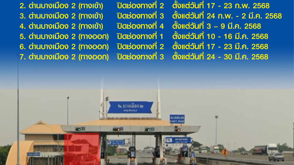 กทพ. แจ้งเบี่ยงการจราจรบริเวณด่านเก็บค่าผ่านฯ บางเมือง 2 ทางพิเศษกาญจนาภิเษก (บางพลี-สุขสวัสดิ์) ตั้งแต่วันที่ 7 ก.พ. 2568 ถึงวันที่ 30 มี.ค. 2568 ตลอด 24 ชั่วโมง