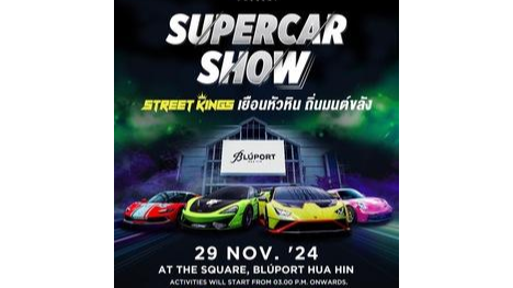 เตรียมตื่นตากับขบวนคาราวาน Supercar ระดับโลก บุกเมืองหัวหิน กับงาน “ STREET KINGS เยือนหัวหิน ถิ่นมนต์ขลัง” อวดโฉมให้ชมกันแบบใกล้ชิดมากกว่า 50 คัน เต็มลาน เดอะสแควร์ บลูพอร์ต หัวหิน วันที่ 29-30 พฤศจิ
