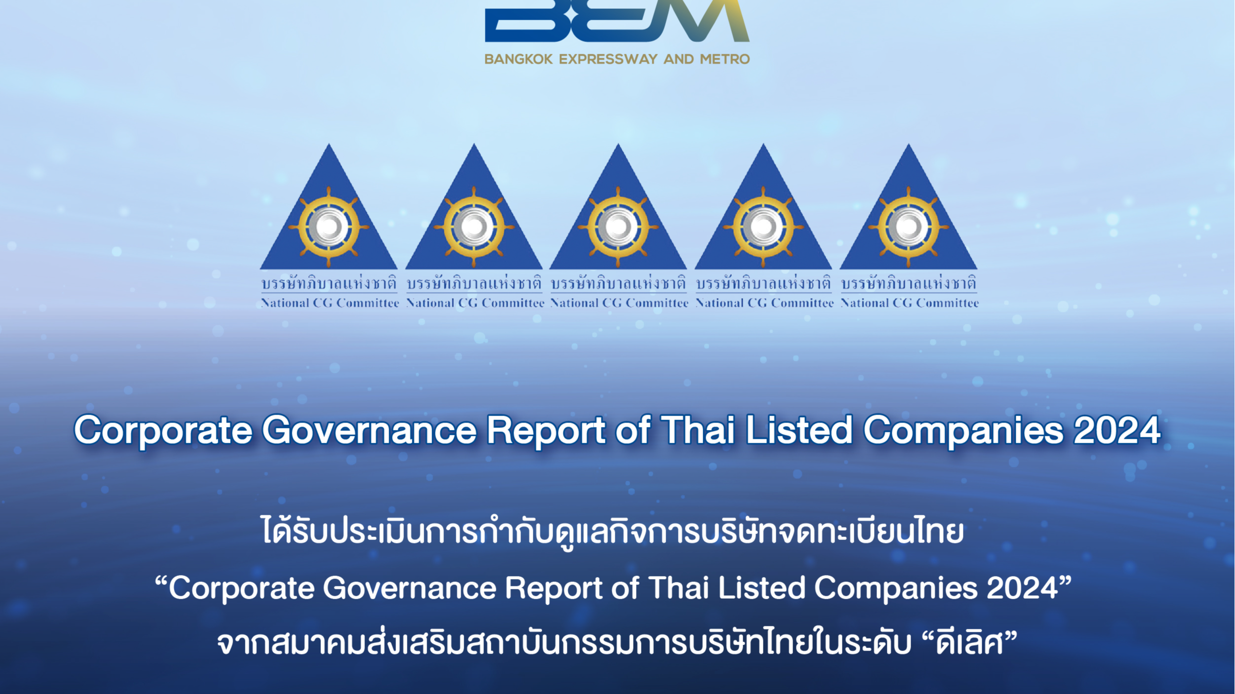 BEM ได้รับการประเมินการกำกับดูแลกิจการบริษัทจดทะเบียนไทยในระดับดีเลิศ (Excellent CG Scoring) หรือระดับ “5 ดาว” ติดต่อกันอย่างต่อเนื่อง