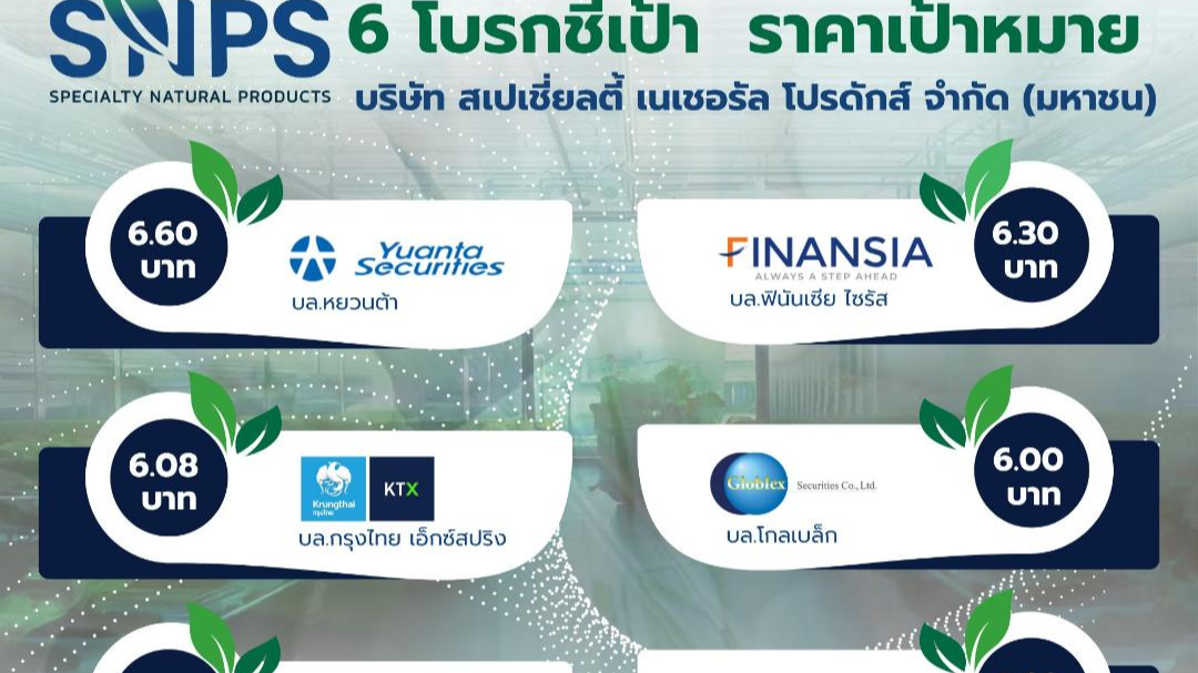 6 โบรกฯ ส่อง SNPS ให้เป้า 5.60 – 6.60 บาท มองพื้นฐานแกร่ง รับอานิสงค์เทรนด์รักสุขภาพดันอุตสาหกรรมขาขึ้น นักวิเคราะห์ชั้นนำ เคาะราคาหุ้น “สเปเชี่ยลตี้ เนเชอรัล โปรดักส์” (SNPS) ให้เป้า 5.60 - 6.60 บาท เล็งแนวโน้มกำไรสุทธิปี 2567 โตโดดเด่น รับผลบวกอุตสาหก
