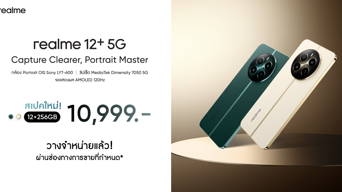 realme 12+ 5G” อัปสเปกใหม่ 12/256GB ในราคาเพียง 10,999 บาท มอบประสบการณ์ถ่ายภาพสไตล์ Portrait Master ที่ลื่นไหลขึ้น เสริมประสิทธิภาพชิป Dimensity 7050 5G ให้ตอบสนองไวในทุกแอปพลิเคชัน เริ่มวางจำหน่ายพร้อมกัน 31 พฤษภาคม ทั่วประเทศ