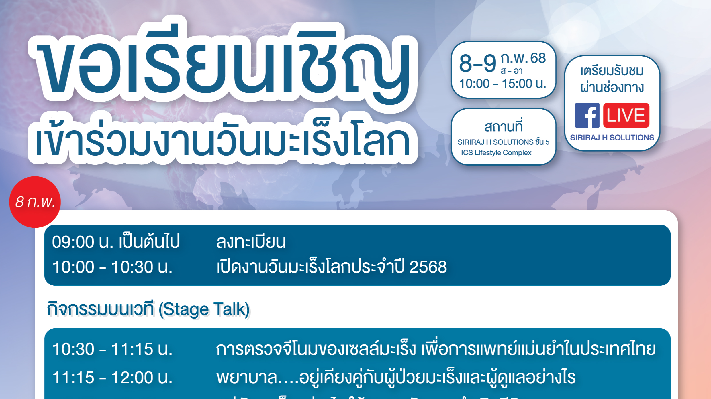 ไอซีเอส ไลฟ์สไตล์ คอมเพล็กซ์ ร่วมกับ สถานวิทยามะเร็งศิริราช และ SIRIRAJ H SOLUTIONS จัดงาน “วันมะเร็งโลก ประจำปี 2568” เปิดเวทีเสวนาโดยแพทย์ผู้เชี่ยวชาญ พร้อมกิจกรรมหลากหลาย ให้ผู้สนใจเข้าร่วมฟรี ระหว่างวันที่ 8-9 กุมภาพันธ์ 2568 ณ SIRIRAJ H SOLUTIONS