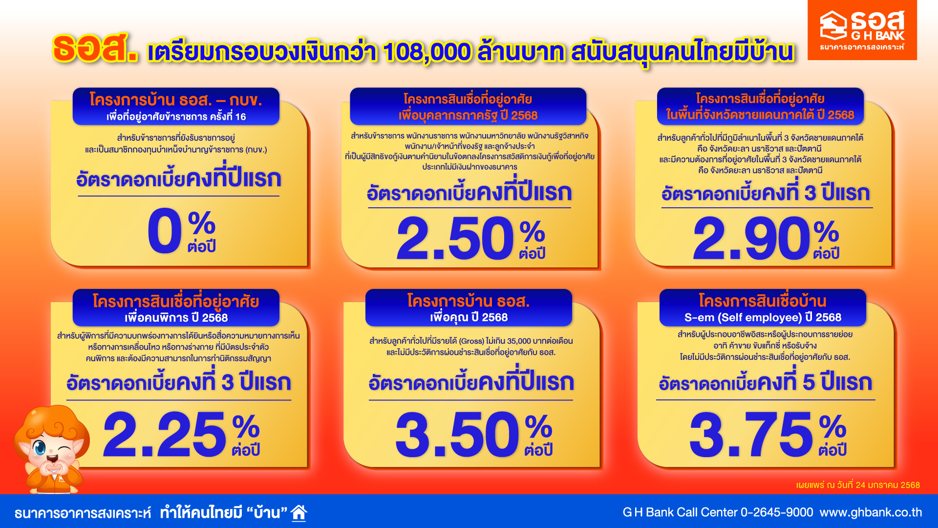 ธอส. เตรียมกรอบวงเงินกว่า 108,000 ล้านบาท สนับสนุนคนไทยมีบ้านเป็นของตนเอง จัดทำสินเชื่อบ้านอัตราดอกเบี้ยต่ำ เริ่มต้น 0% นาน 1 ปี