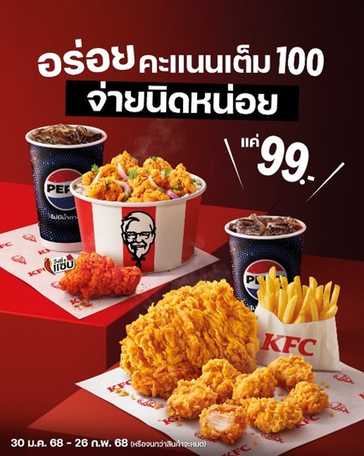 สิ้นเดือน แต่ไม่สิ้นใจ คิดมาให้แล้วว่าต้องรอด! กับชุด “อิ่มคุ้มข้าว” ที่มีข้าวไก่แซ่บโบว์ล หรือ ข้าวไก่กรอบแกงเขียวหวาน 1 ที่, วิงซ์แซ่บ 1 ชิ้น และ “อิ่มคุ้มไก่” ไก่ทอด 1 ชิ้น, ชิกเก้น ป๊อป 7 ชิ้น, เฟรนช์ฟรายส์ (ปกติ) 1 ที่ ทั้งสองชุดมาพร้อมเป๊ปซี่รีฟิล เติมได้ไม่อั้นที่ KFC ในราคาชุดละ 99 บาทเท่านั้น!
