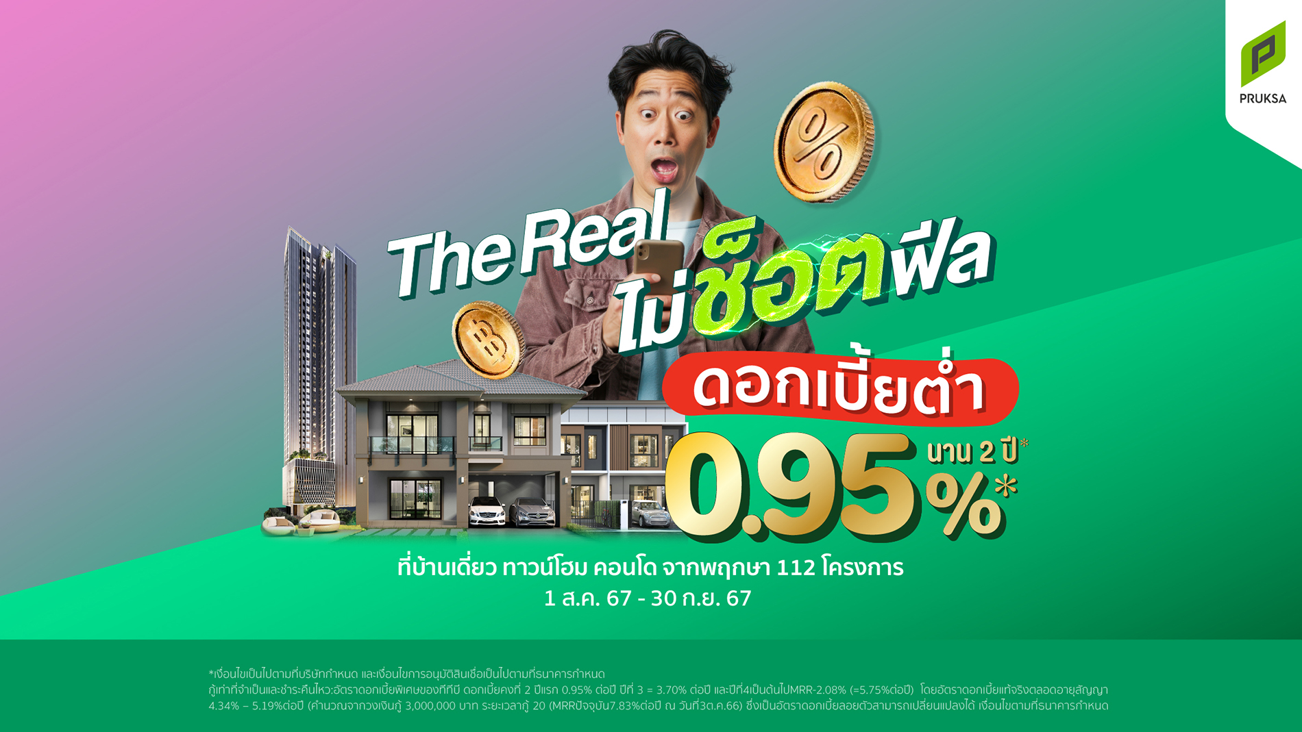 พฤกษา แรงไม่หยุด รวบ 112 โครงการ ทั้งบ้าน ทาวน์โฮม คอนโดมิเนียม จัดแคมเปญสะท้านวงการ “The Real ไม่ช็อตฟีล” จัดหนักจัดเต็มกับโปรโมชันดอกเบี้ยต่ำ 0.95% ต่อปี คงที่นานถึง 2 ปี ผ่อนต่ำเพียงล้านละ 900 บาท นาน 2 ปี พร้อมส่วนลดหรือของแถมสูงสุดถึง 2 ล้านบาท ฟรีค่าโอน ฟรีเฟอร์นิเจอร์ ฟรีเครื่องใช้ไฟฟ้า ตั้งแต่วันนี้ ถึง 30 กันยายน 2567