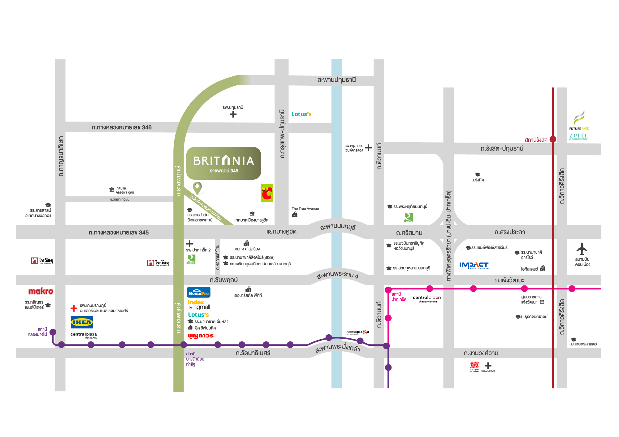 บริทาเนีย ราชพฤกษ์ 345 (Britania Ratchaphruek 345) ตั้งอยู่บนถนน องค์การบริหารส่วนจังหวัด ริมคันคลองเกาะเกรียง ตำบลบางคูวัด อำเภอเมือง จังหวัดปทุมธานี พื้นที่โครงการ 22-1-29.66 ไร่ พื้นที่ส่วนกลางประมาณ 1 ไร่ มอบสังคมเป็นส่วนตัวด้วยบ้านจำนวนเพียง 111 ยูนิต แบ่งเป็นบ้านเดี่ยวและบ้านแฝด ขนาดเริ่ม 145 ตร.ม. – 190 ตร.ม. ราคาเริ่ม 4.89 – 8 ล้านบาท ใกล้สถานที่สำคัญๆ อย่าง อิมแพ็ค อารีนา เมืองทองธานี และศูนย์ราชการ โดยแบ่งออกเป็น 4 Best ด้วยกัน ได้แก่ Best Location, Best Facilities, Best Living Solution และ Best Service