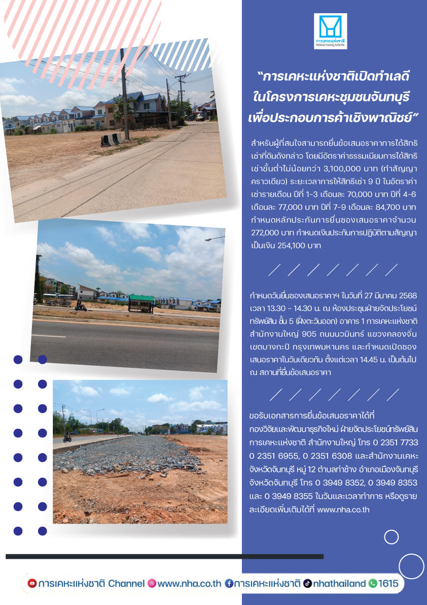 นางนลินี ขำเจริญ รักษาการผู้อำนวยการฝ่ายจัดประโยชน์ทรัพย์สิน กล่าวว่าการเคหะแห่งชาติเปิดทำเลดีให้เอกชนยื่นข้อเสนอราคาการได้สิทธิเช่าที่ดินเพื่อประกอบการค้าเชิงพาณิชย์ในโครงการเคหะชุมชนจันทบุรี บางส่วนของโฉนดเลขที่ 75290 ขนาดเนื้อที่ประมาณ 4-0-56.5 ไร่ เพื่อให้เกิดความโปร่งใสในการดำเนินงานทุกขั้นตอนตามหลักธรรมาภิบาล การเคหะแห่งชาติจึงเปิดโอกาสให้เอกชนที่สนใจสามารถยื่นข้อเสนอราคาการได้สิทธิเช่าที่ดินดังกล่าวโดยมีอัตราค่าธรรมเนียมการได้สิทธิเช่าขั้นต่ำไม่น้อยกว่า 3,100,000 บาท (ทำสัญญาคราวเดียว) ระยะเวลาการให้สิทธิ เช่า 9 ปี ระยะเวลาปลอดค่าเช่า 6 เดือน ในอัตราค่าเช่ารายเดือน ปีที่ 1-3 เดือนละ 70,000 บาท ปีที่ 4-6 เดือนละ 77,000 บาท ปีที่ 7-9 เดือนละ 84,700 บาท กำหนดหลักประกันการยื่นซองเสนอราคาจำนวน 272,000 บาท กำหนดเงินประกัน การปฏิบัติตามสัญญา เป็นเงิน 254,100 บาท โดยกำหนดวันยื่นซองเสนอราคาฯ ในวันที่ 27 มีนาคม 2568 เวลา 13.30 – 14.30 น. ณ ห้องประชุมฝ่ายจัดประโยชน์ทรัพย์สิน ชั้น 5 (ฝั่งตะวันออก) อาคาร 1 การเคหะแห่งชาติ สำนักงานใหญ่ 905 ถนนนวมินทร์ แขวงคลองจั่น เขตบางกะปิ กรุงเทพมหานคร และกำหนดเปิดซองเสนอราคาในวันเดียวกัน ตั้งแต่เวลา 14.45 น. เป็นต้นไป ณ สถานที่ยื่นข้อเสนอราคา