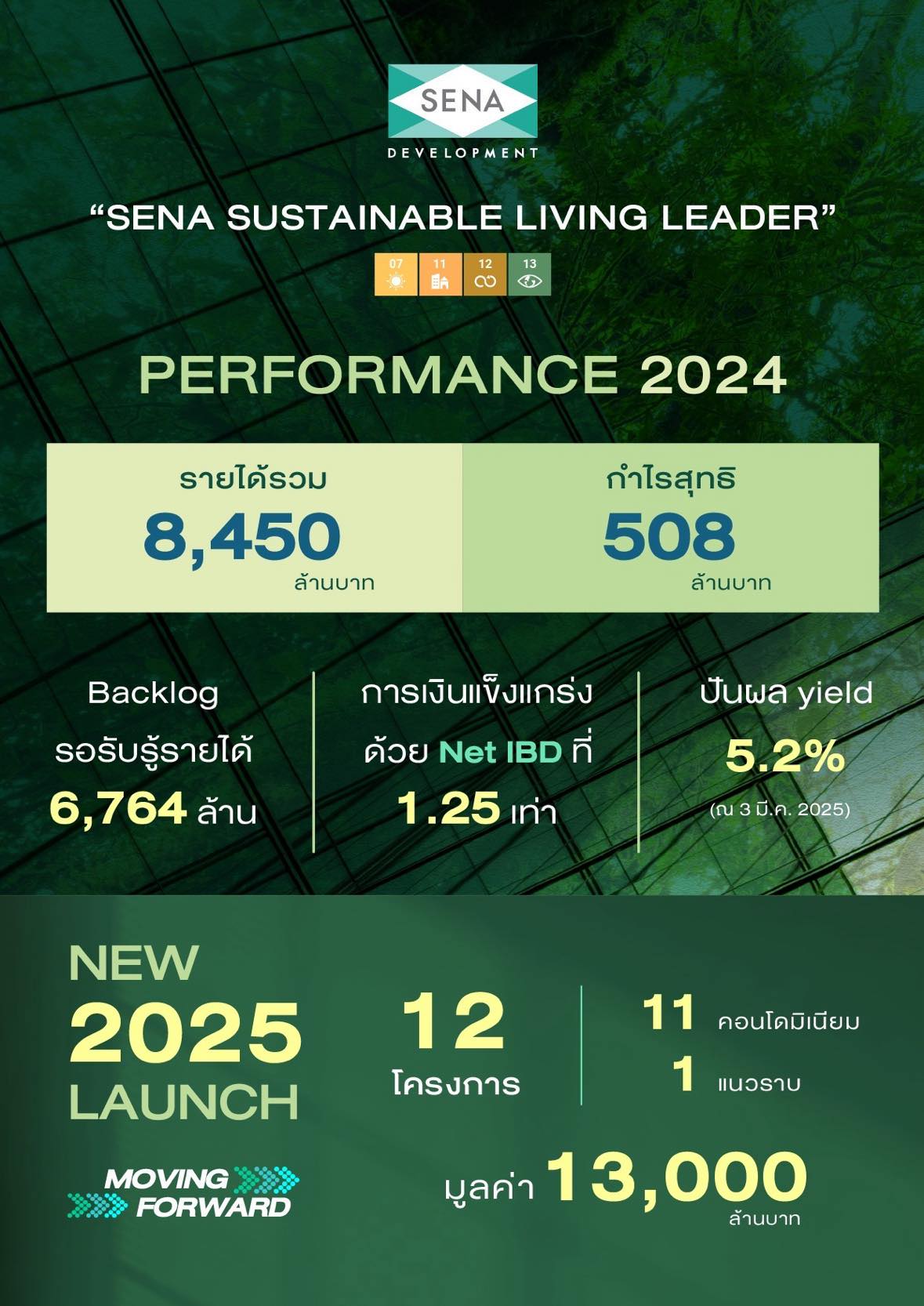 นางสาวอธิกา บุญรอดชู ผู้ช่วยกรรมการผู้จัดการ สายงานจัดสรรเงินและการลงทุน บริษัท เสนาดีเวลลอปเม้นท์ จำกัด (มหาชน) หรือ SENA เปิดเผยถึงผลประกอบการงวดปี 2567 ว่า ในปีนี้ทุกประเภทธุรกิจมีรายได้รวมกัน 8,450.87 ล้านบาท ประกอบด้วย รายได้จากธุรกิจอสังหาริมทรัพย์เพื่อขาย 5,901.43 ล้านบาท อสังหาริมทรัพย์เพื่อเช่า 131.00 ล้านบาท ธุรกิจบริหารโครงการ และบริการอื่น ๆ 1,448.25 ล้านบาท ธุรกิจเกี่ยวข้องกับพลังงานสะอาด 695.05 ล้านบาท และรายได้อื่น ๆ 275.15 ล้านบาท โดยมียอดขายจากธุรกิจอสังหาริมทรัพย์รวมทั้งปี 14,326 ล้านบาท เป็นยอดขายจากอสังหาริมทรัพย์เพื่อขาย 12,447 ล้านบาท ปัจจุบันมียอดทำสัญญาจาก LivNex จำนวน 548 ยูนิต มูลค่า 1,032 ล้านบาท ซึ่งยอดขาย LivNex จะสามารถทยอยเปลี่ยนเป็นยอดโอนกรรมสิทธิ์ได้ภายในเวลา 3 ปี นับจากนี้