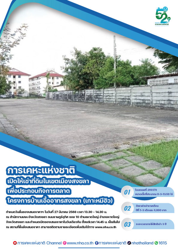 การได้สิทธิเช่าที่ดินดังกล่าวโดยมีอัตราค่าธรรมเนียมการได้สิทธิเช่าขั้นต่ำไม่น้อยกว่า 6,000 บาท ระยะเวลาการให้สิทธิเช่า 3 ปี ในอัตราค่าเช่ารายเดือน ปีที่ 1-3 เดือนละ 6,000 บาท กำหนดหลักประกันการยื่นซองเสนอราคาจำนวน 5,000 บาท กำหนดเงินประกันการปฏิบัติตามสัญญา เป็นเงิน 18,000 บาท โดยกำหนดวันยื่นซองเสนอราคาฯ ในวันที่ 27 มีนาคม 2568 เวลา 13.30 – 14.30 น. ณ สำนักงานเคหะจังหวัดสงขลา ถนนราษฎร์อุทิศ ซอย 10 ตำบลหาดใหญ่ อำเภอหาดใหญ่ จังหวัดสงขลา และกำหนดเปิดซอง เสนอราคาในวันเดียวกัน ตั้งแต่เวลา 14.45 น. เป็นต้นไป ณ สถานที่ยื่นข้อเสนอราคา