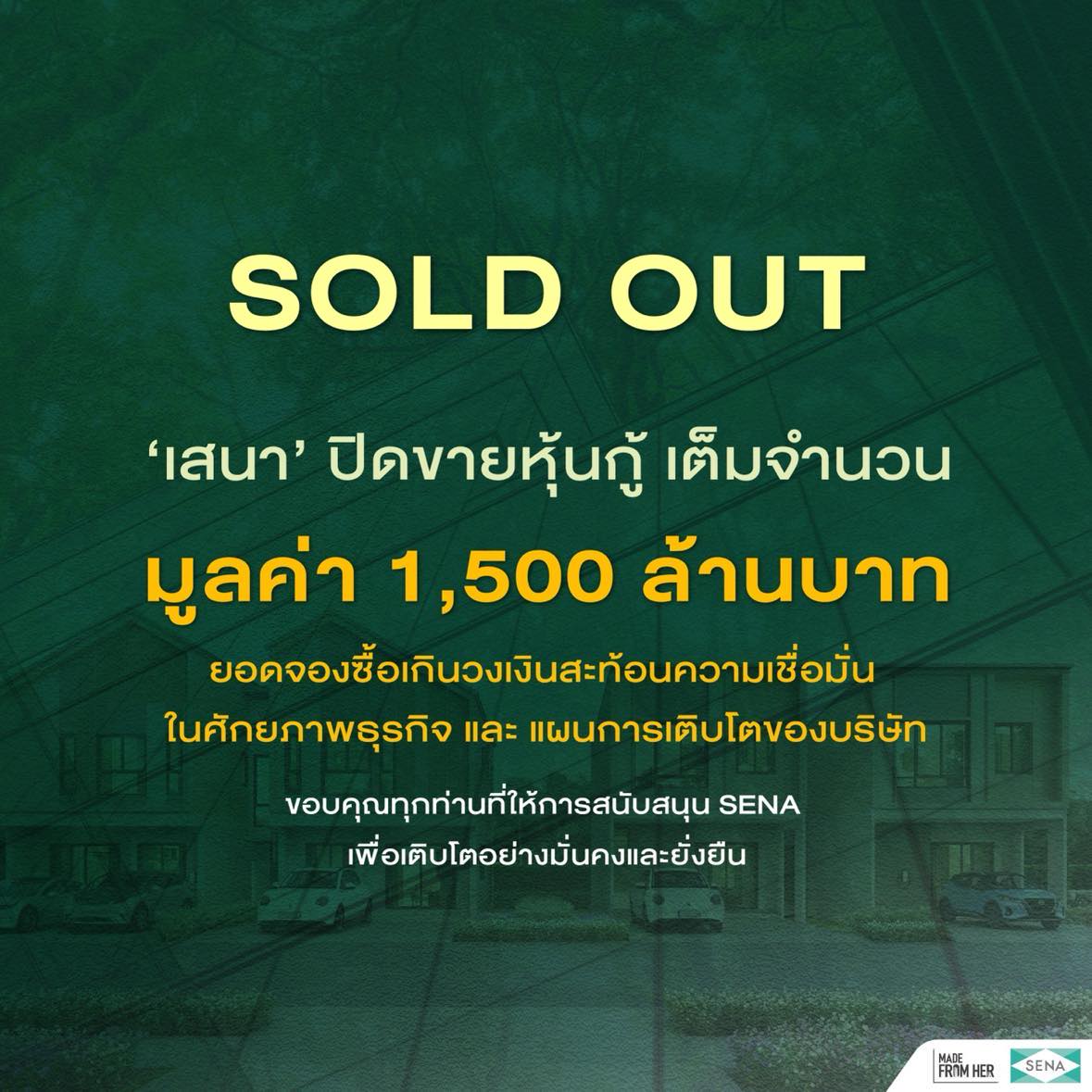 “บริษัทขอขอบคุณนักลงทุนทุกท่านที่ให้ความสนใจและไว้วางใจลงทุนในหุ้นกู้ของ SENA เป็นอย่างดีเสมอมา ตลอดจนขอขอบคุณบริษัทหลักทรัพย์ผู้จัดจำหน่ายหุ้นกู้ทั้ง 12 แห่ง ได้แก่ บล. เอเซีย พลัส, บล. หยวนต้า (ประเทศไทย), บล.กรุงไทย เอ็กซ์สปริง, บล. โกลเบล็ก, บล.พาย, บล.ดาโอ (ประเทศไทย), บล.ยอนด์, บล. เมย์แบงก์ (ประเทศไทย), บล.เมอร์ชั่น พาร์ทเนอร์, บล.ทรีนีตี้, บล.บลูเบลล์ และบล. เอเอสแอล ที่ให้การสนับสนุนบริษัทเป็นอย่างดี ตอกย้ำถึงความเชื่อมั่นที่นักลงทุนมีต่อบริษัท”