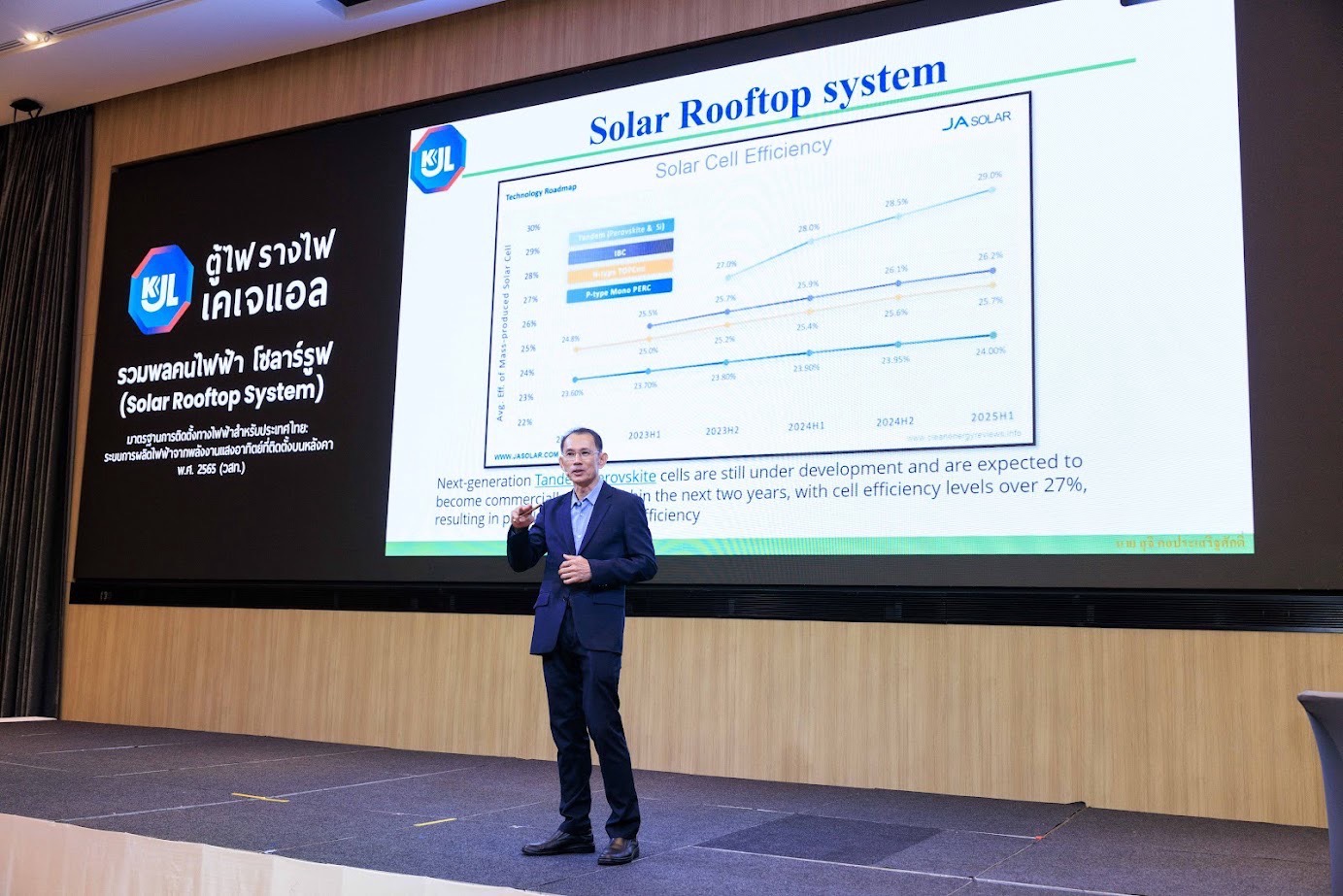 บริษัท กิจเจริญ เอ็นจิเนียริ่ง อีเลคทริค จำกัด (มหาชน) หรือ KJL มุ่งมั่นพัฒนาผลิตภัณฑ์ตู้ไฟ รางไฟ และสินค้าอื่น ๆ เพื่อตอบสนองทุกความต้องการของอุตสาหกรรม ด้วยเทคโนโลยีการผลิตอันทันสมัยจากประเทศญี่ปุ่น ผสานกับเครื่องจักรและนวัตกรรมที่ล้ำสมัย ทำให้ผลิตภัณฑ์ของบริษัทฯโดดเด่นด้วยความแม่นยำสูง มีคุณภาพมาตรฐานระดับโลก แข็งแรง ทนทาน และปลอดภัย พร้อมส่งมอบถึงมือลูกค้าอย่างรวดเร็ว KJL จึงได้จัดงานสัมมนา “รวมพลคนไฟฟ้า โซลาร์รูฟ” (Solar Rooftop System) กิจกรรมเชิงวิชาการ ที่รวบรวมความรู้เกี่ยวกับมาตรฐานการติดตั้งทางไฟฟ้าสำหรับประเทศไทย : ระบบการผลิตไฟฟ้าจากพลังงานแสงอาทิตย์ ที่ติดตั้งบนหลังคา ซึ่งได้รับความไว้วางใจจากช่างไฟฟ้า วิศวกร ผู้รับเหมา และองค์กรชั้นนำต่างๆ ให้เป็นผู้นำด้านนวัตกรรมตู้ไฟ ที่พร้อมตอบโจทย์ทุกความต้องการของงานระบบไฟฟ้าอย่างครบวงจร ซึ่งสินค้าที่ตอบโจทย์ตลาดด้านงานสื่อสาร และงาน Solar Cell ที่เป็นเทรนด์ที่มาแรงที่สุดในปีนี้ คือ KJL WALKWAY ตะแกรงทางเดินงานโซล่าเซลล์ เพื่อซ่อมบำรุงบนหลังคานอกอาคาร และรางเทรย์งานเบา (แบบเจาะรูระบายอากาศ) Light Duty Series เหมาะสำหรับงานติดตั้งระบบสายไฟฟ้าภายในและภายนอกอาคาร ที่มีน้ำหนักไม่มาก (งานเบา) สวยงาม และต้องการการระบายความร้อน ได้เป็นอย่างดี