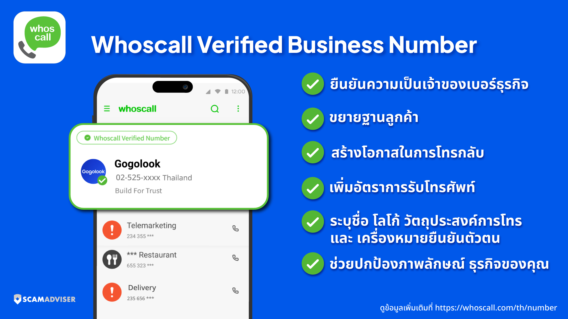ลูกค้าธุรกิจที่สนใจ Whoscall Verified Numbers ดูรายละเอียดเพิ่มเติมได้ที่ https://whoscall.com/th/number