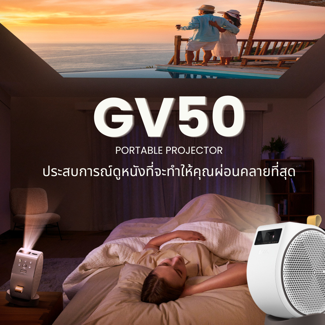 GV50 จึงเป็นโปรเจคเตอร์พกพารุ่นใหม่ที่น่าจับตามอง ซึ่งยังคงความยืดหยุ่นในการฉายภาพแนวตั้ง 135 องศาเหมือน GV Series ที่ได้รับความนิยมมาก่อนหน้านี้ โดยมีการอัปเกรดในด้านความสว่าง ตัวฉายแสง และความสามารถของระบบภายใน นอกจากนี้ GV50 ยังถูกออกแบบมาเพื่อการฉายภาพข้างเตียงและฉายขึ้นเพดานโดยเฉพาะ เพื่อให้คุณเพลิดเพลินกับการดูหนังบนเตียงในแบบที่สะดวกสบายที่สุดเหมือนกับ VIP