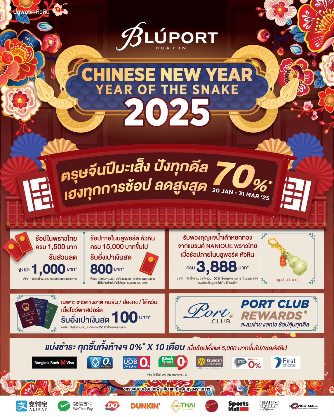 ฉลองเทศกาลตรุษจีน เสริมสิริมงคล ความมั่งคั่ง รับความปังตลอดปี พร้อมกิจกรรมสนุก ๆ กับงาน CHINESE NEW YEAR..YEAR OF THE SNAKE 2025 วันที่ 28 มกราคม – 2 กุมภาพันธ์ 2568 ณ บลูพอร์ต หัวหิน สอบถามข้อมูลเพิ่มเติมได้ที่ โทร.032-905-111 หรือติดตามข่าวสารและกิจกรรมได้ทาง Facebook: BluportHuaHinOfficial, Line official : @bluport